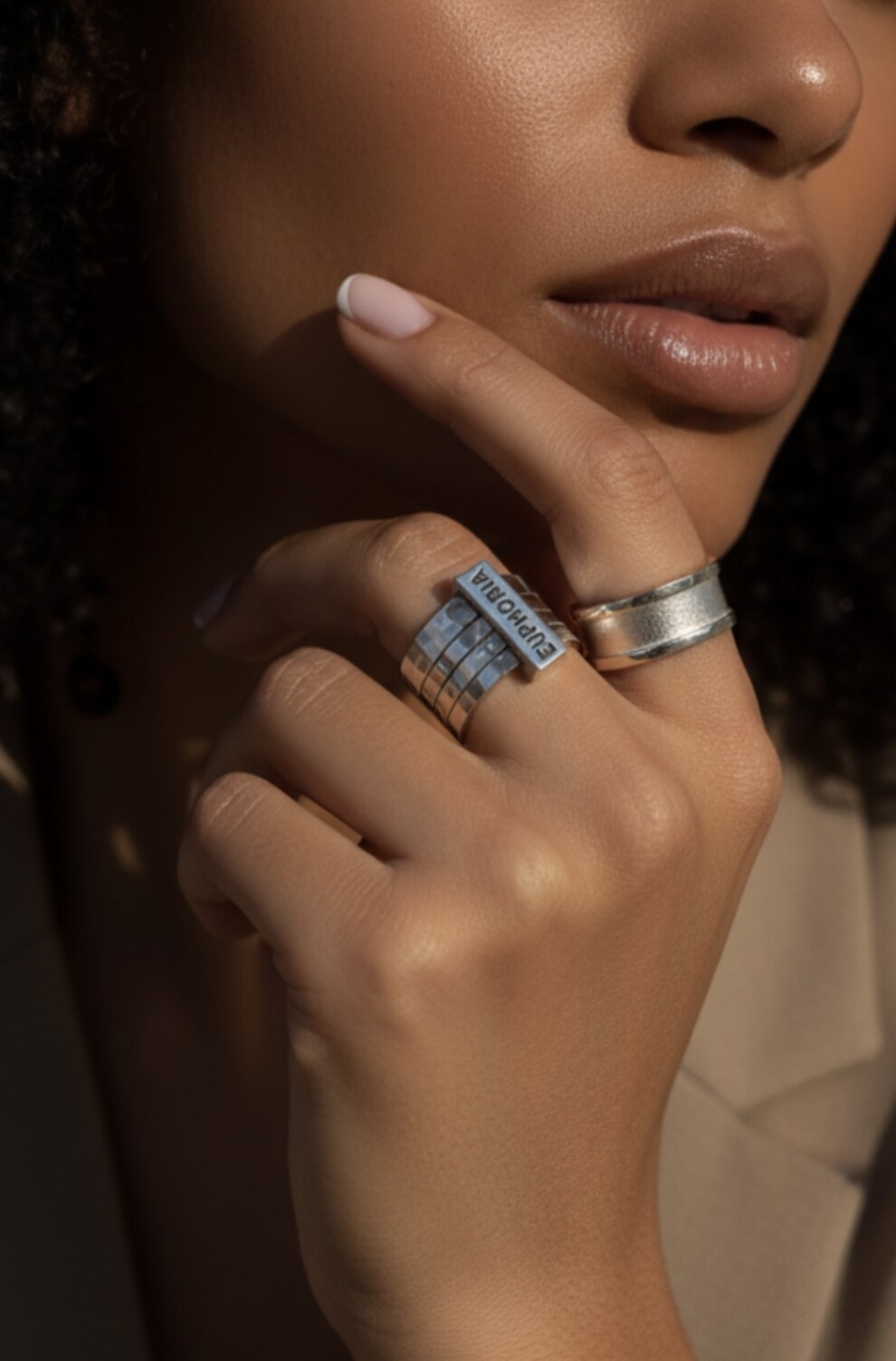 Стильное акцентное кольцо-механизм с битой фактурой и качественной гравировкой слова EUTHORIA (в пер. ЭЙФОРИЯ).
