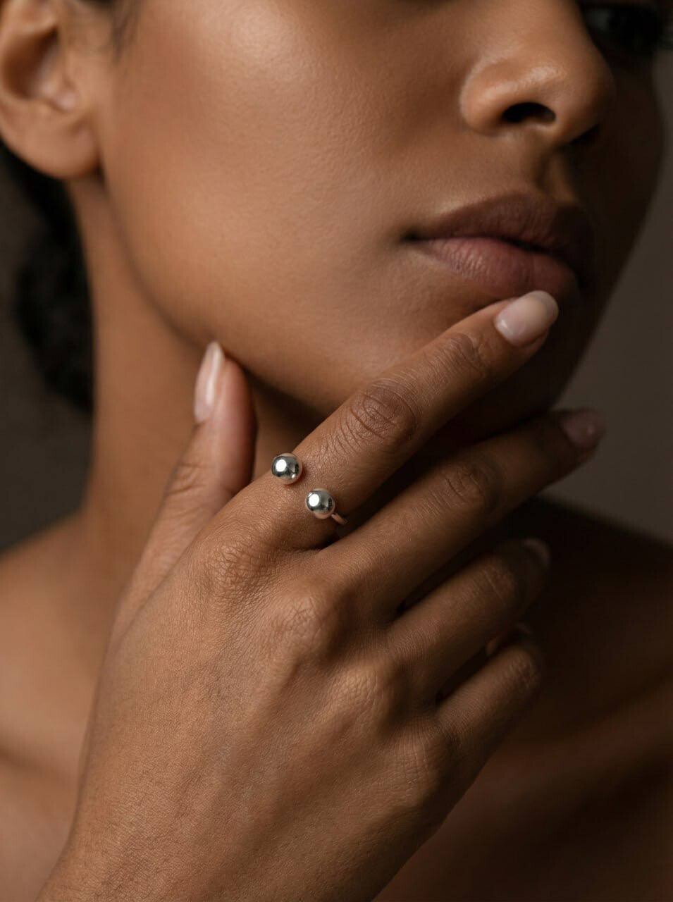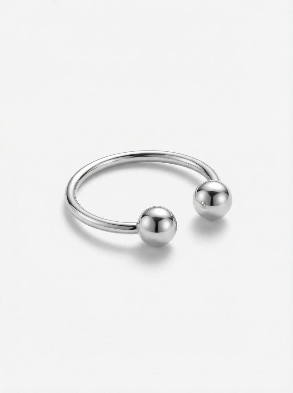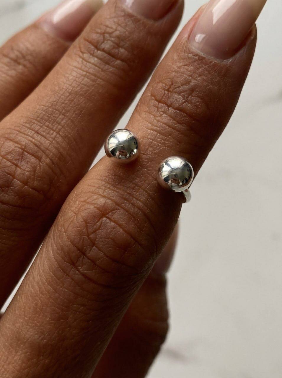 Форма сферы сейчас на пике популярности. В сочетании с зеркальной полировкой это кольцо с серебряными шариками способно растопить сердце любой девушки. Можно составить сэт из двух колец (на верхнюю и нижнюю фалангу) и браслета. Кольца и браслет разъёмные, их можно легко отрегулировать под себя.