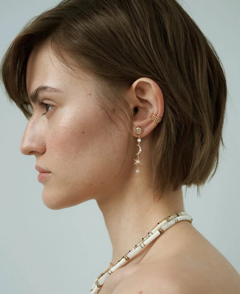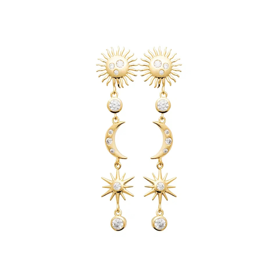 Cверкающие позолоченные серьги с форме светил солнца и луны, украшенных камнями циркония.